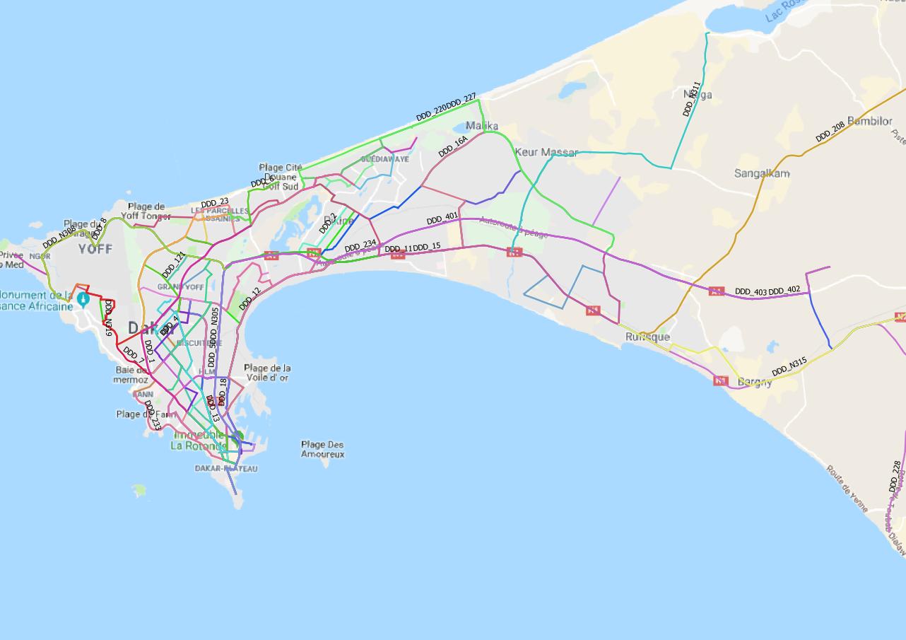 • Terminus Ouakam – Mamelles – Croisement Almadies – Ngor- Yoff – Rte de l’Aéroport – Foire – VDN- Direction Générale DDD – Rond-Point JVC- Rond-Point Liberté 6 – Itinéraire 213 – Police Grand Yoff – Pharmacie Patte d’Oie – Autoroute à Péage – Diamniadio – AIBD.